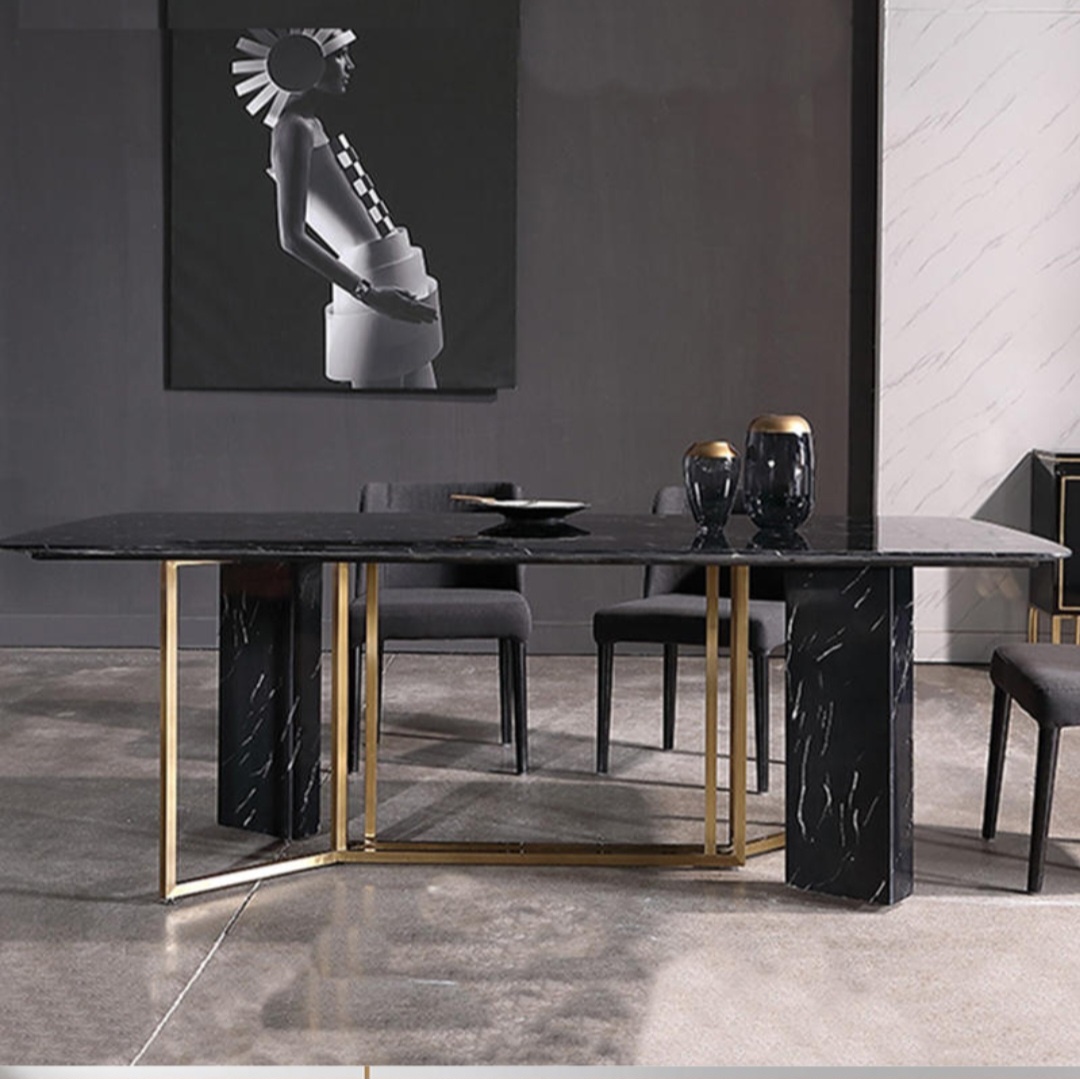 £1,359.00Modern rectangular dining table featuring a marble sintered stone top and a sturdy carbon Stainless steel frame in black or gold finishes. Available in black and white marble options. Designed with food-grade materials and titanium gold Stainless steel accents