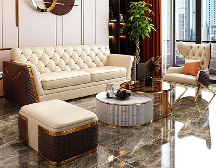 Microfiber leather+high density sponge+wooden frame+golden stainless steel