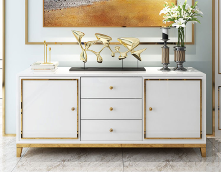 £1,670.00Luxury modern sideboard buffet made from solid wood with a glossy finish, tempered glass top, and gold Stainless steel legs. Features 2 doors and 3 drawers with gold handles for elegant storage. Available in black and white, this stylish piece is perfect for contemporary dining spaces. Size: 150x40x65 cm.