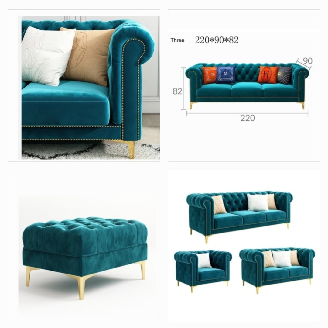 A collection of handcrafted dining room furniture items made from solid mahogany wood, finished in champagne gold leaf. Includes a large dining table, a glass display cabinet with drawers and shelves, and a set of chairs and armchairs upholstered in luxurious velvet. All items feature high-quality craftsmanship and elegant design.