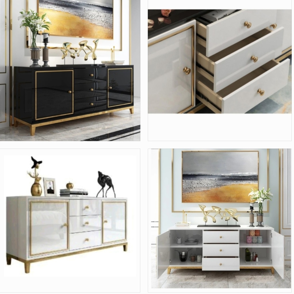 £1,670.00Luxury Modern Sideboard with Glossy Finish and Tempered Glass Top solid Wood Frame, Gold Stainless Steel Legs, 2 Doors + 3 Drawers. Available in White or Black.