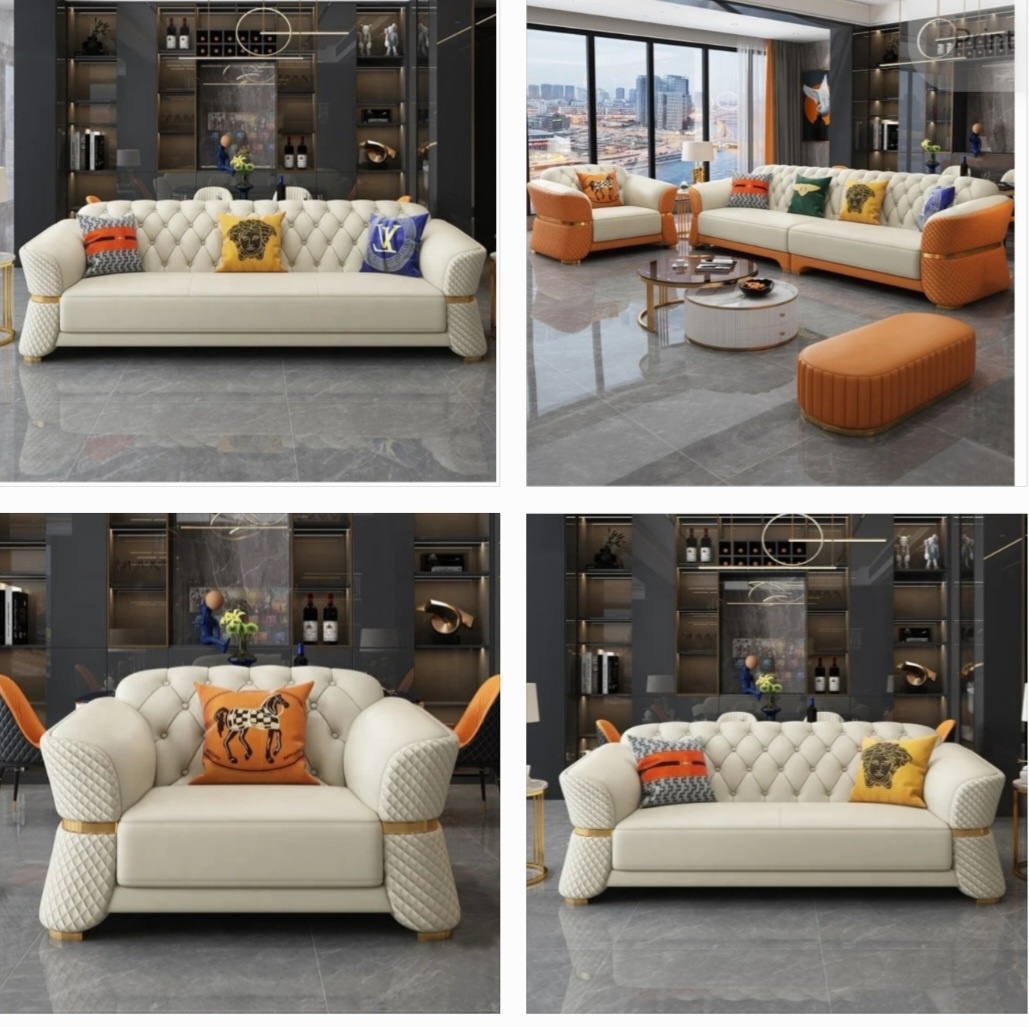 Living room Furniture – Leather Armchair Sofa (Modern Chesterfield Design with Gold Trims). Available in one-seater (W120?D95?H85 cm) and two-seater (W166?D95?H85 cm) sizes. Made with solid wood, leather, high-density sponge, and Stainless steel. Colouroptions: Cream and orange. Style: Modern Classic.