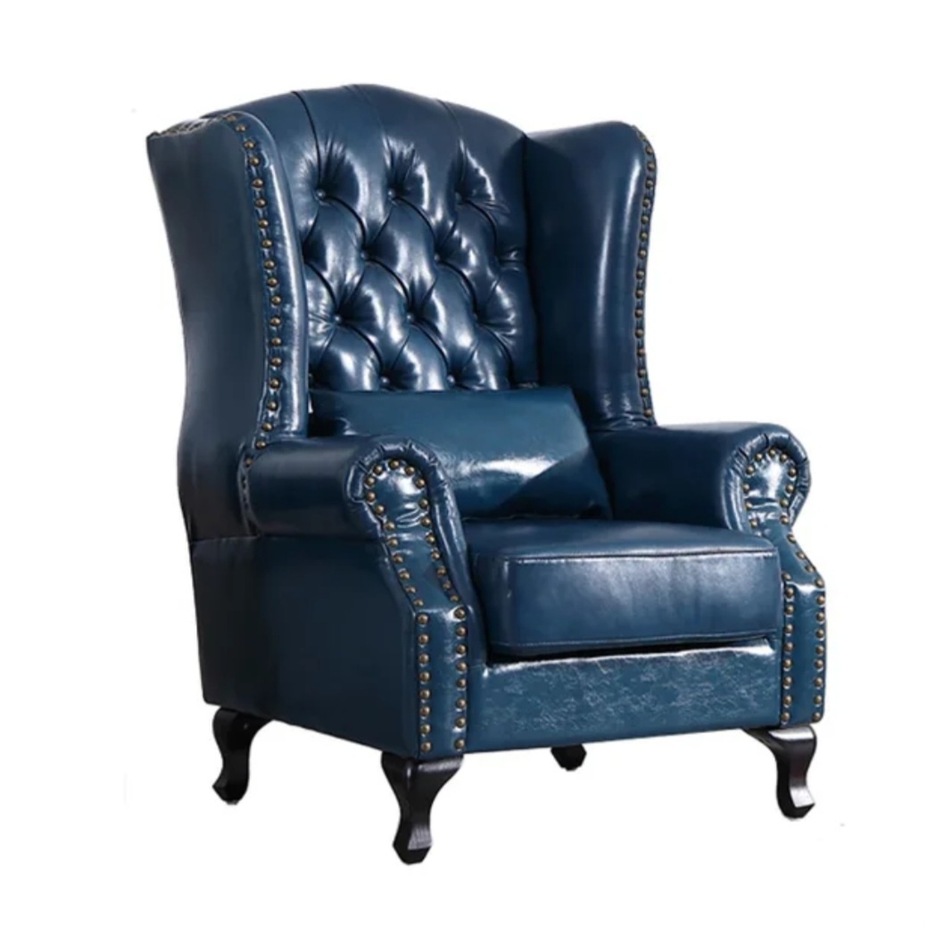 Living room Furniture – Leather Armchair Sofa (Modern Chesterfield Design with Gold Trims). Available in one-seater (W120?D95?H85 cm) and two-seater (W166?D95?H85 cm) sizes. Made with solid wood, leather, high-density sponge, and Stainless steel. Colouroptions: Cream and orange. Style: Modern Classic.