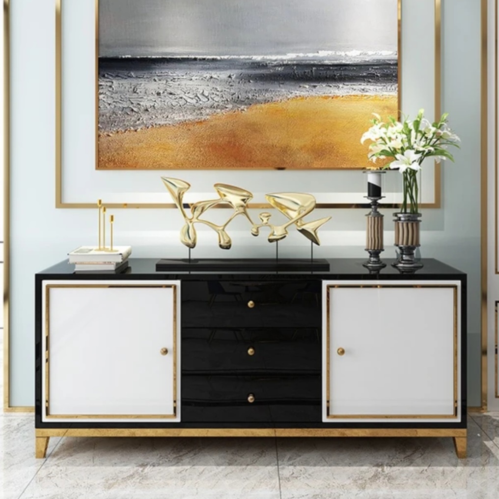 £1,670.00Luxury modern sideboard buffet made from solid wood with a glossy finish, tempered glass top, and gold Stainless steel legs. Features 2 doors and 3 drawers with gold handles for elegant storage. Available in black and white, this stylish piece is perfect for contemporary dining spaces. Size: 150x40x65 cm.