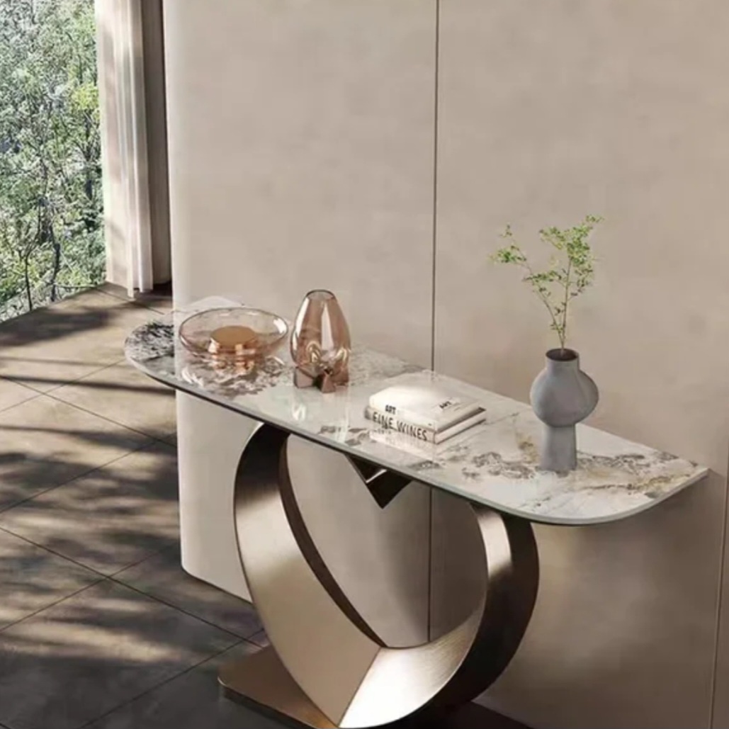 £1,790.00Luxury marble console table featuring a marble sintered stone top with a titanium gold-plated Stainless steel frame and base. Modern design available in black and white. Ideal for elegant living room settings